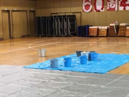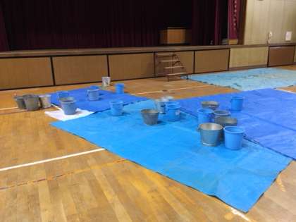 先日お知らせした台風21号で被害を受けた講堂ですが、金曜日の夜から降り続いた雨により多数雨漏りが見られました。