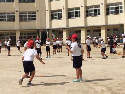 4年生はヤングマンの曲に合わせてなわとびを使ってダンスをしていました。写真はなわとびの2人技や3人技の練習をしているところです。