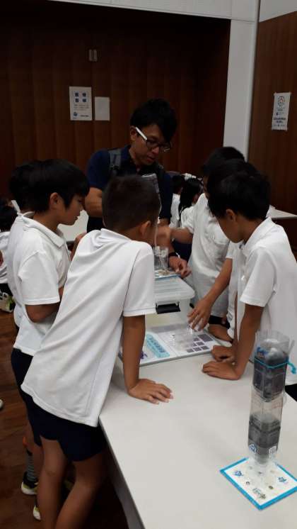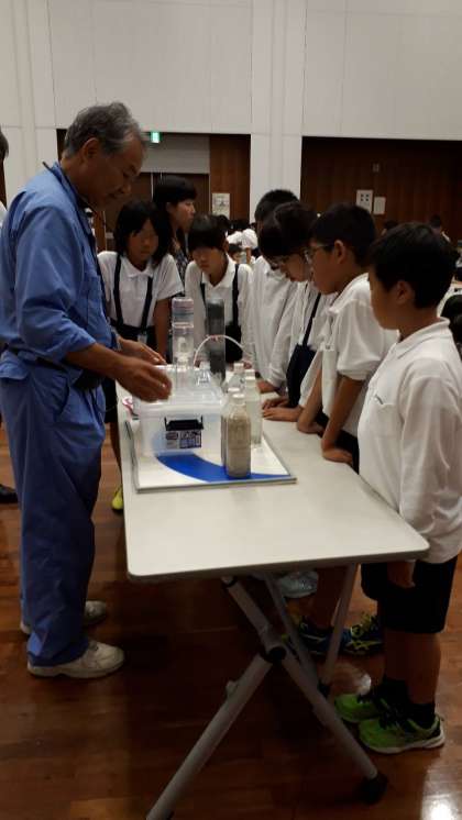 映像で復習した後、実験をして汚れた水がきれいになっていく仕組みを学びました。