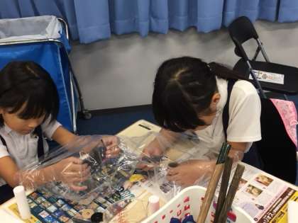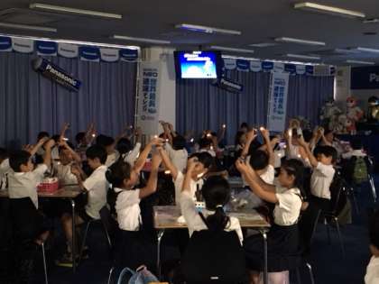 電池づくりの最後に部屋を暗くして完成した電池で豆電球をつけ、点灯式をしました。子どもたちは豆電球の明かりを見てとても楽しそうでした。