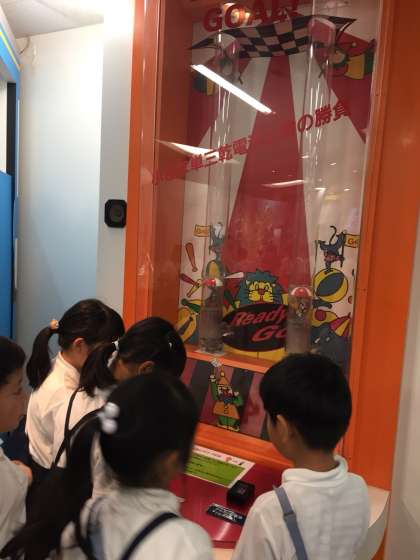 電池づくりのあとに工場見学と体験学習をしました。電池づくりで自分たちがした作業を工場で機械がしている様子を見学して機械の速さに驚きの声を上げていました。