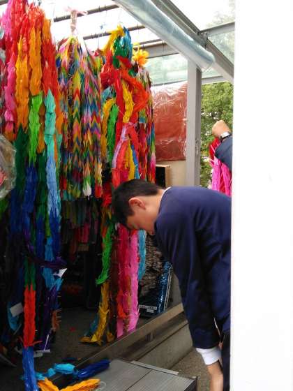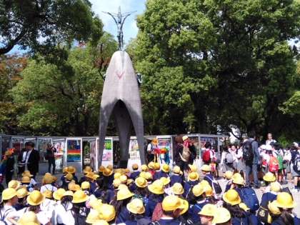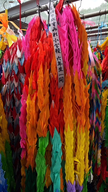 平和記念公園で平和の集いをしました。平和宣言をして全児童で作った千羽鶴をささげてきました。