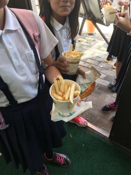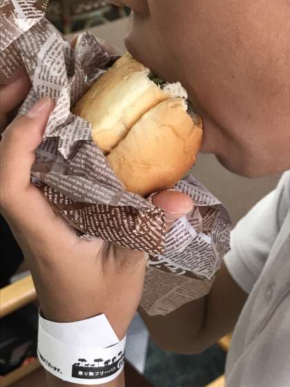 クーポンを使ってグループごとに食事です。おなかがすき過ぎ?大きなハンバーガーをパクパク!
