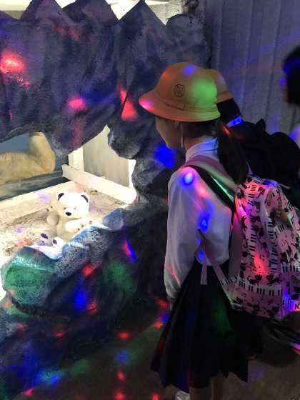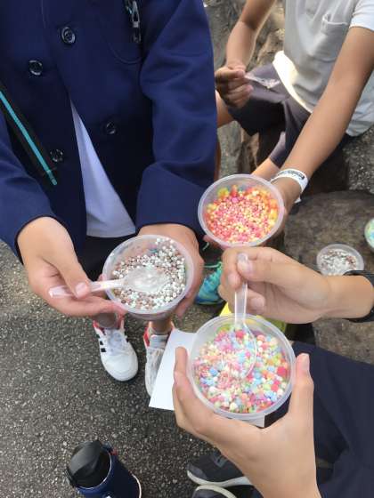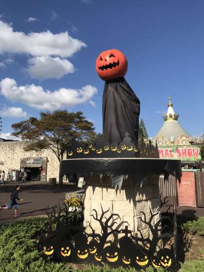 ハロウィン仕様の園内でアトラクションを楽しんだり、おやつを食べたりして楽しんでいます。間もなく集合の時間です。
