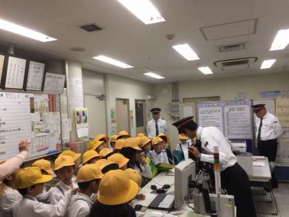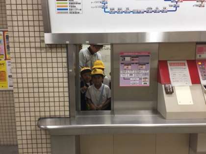 駅では駅員さんがホームや駅員室の中を案内してくれました。券売機の裏側を見たり、券売機横の窓から外をのぞいたり、ふだんは見ることのできない所を案内していただき、子どもたちは目を輝かせて見学していました。