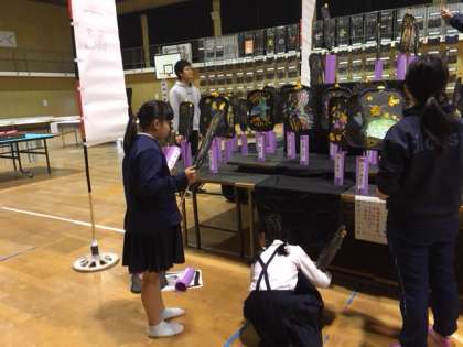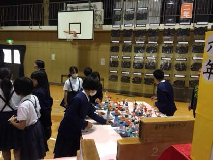 明日から始まる作品展に向け児童が作品を講堂に搬入しました。