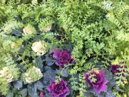 校門横の「すみれ元気花壇」には紅白の葉牡丹が葉を広げています。