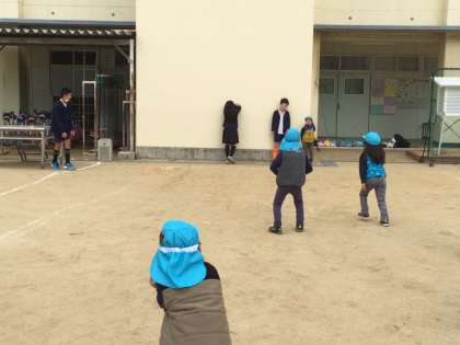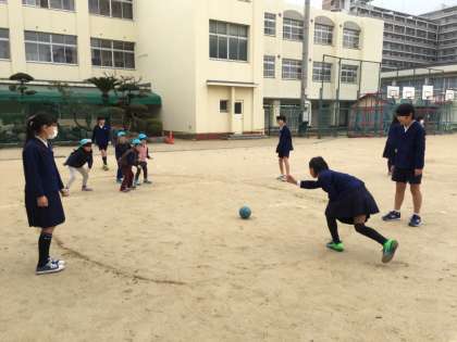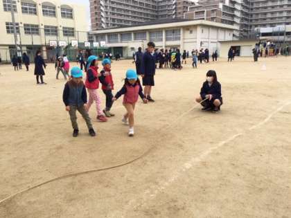 最初はお互いに緊張しているようでしたが徐々に打ち解けて楽しく遊ぶことができました。5年生は優しく声をかけ、ボールやなわとび、だるまさんが転んだなどをしていました。