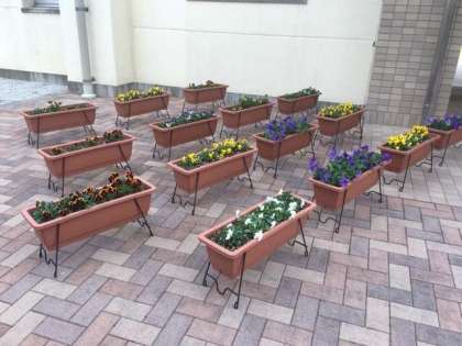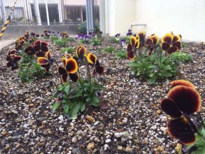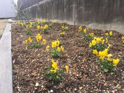 管理作業員が育てているビオラが見どころを迎えています。玄関や校門横の花壇にたくさん植えられて春の訪れを感じさせてくれます。