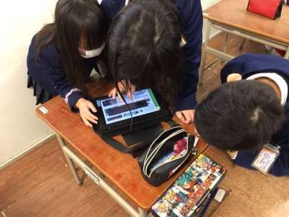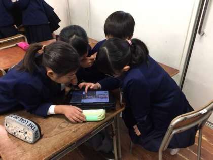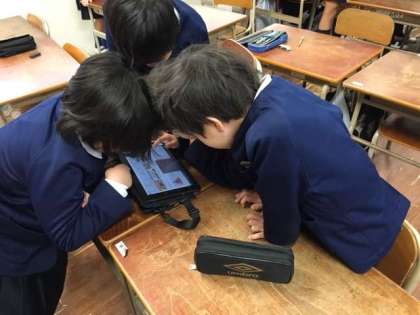 2年生が国語の時間にタブレットを使って昔話について調べていました。グループで1台ずつ使い、友だちと協力しながら調べることができていました。
