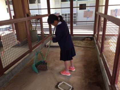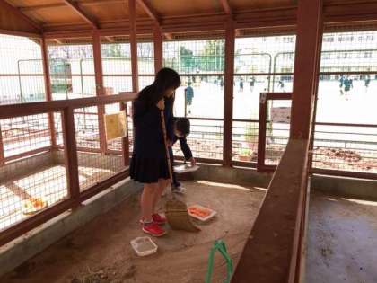 毎日、昼休みには飼育委員会がウサギ小屋の掃除とエサとみずをあげて世話をしています。飼育委員の児童がウサギの前足が「ふわふわして気持ちがいいねん」と教えてくれました。