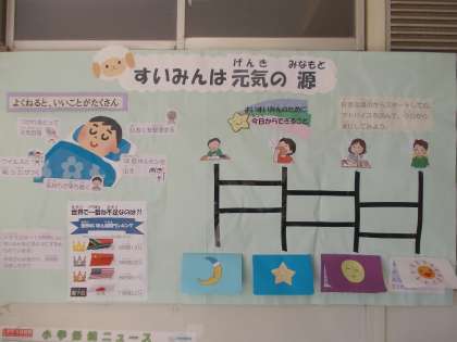 睡眠は元気の源ということで、子どもたちの睡眠のことについてわかりやすく、そして興味が持てるように掲示してあります。通るたびに隠された部分をめくっている児童に出会います。小学生の間は特に睡眠が大事です。ご家庭でも早寝早起きをし、健康に留意して過ごせるようにお声がけをお願いします。