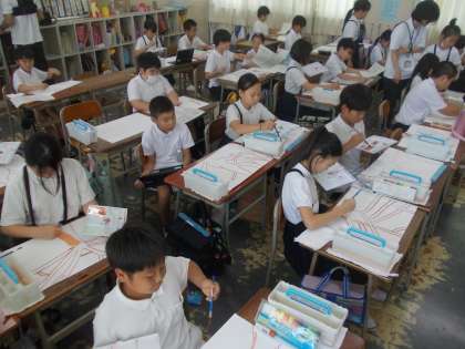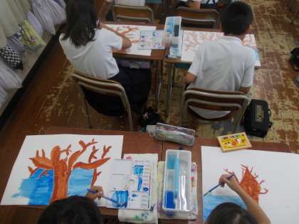 図工でバスと絵の具で木を描いていました。これからどんな絵が完成するのでしょうか。楽しみです。はみ出さずに塗ろうとか濃淡をどうするかなどを考えて集中して頑張っていました。