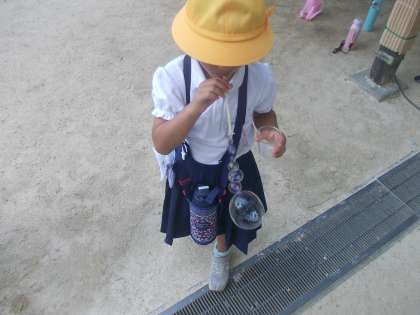 生活科の学習でしょうか。シャボン玉をたくさん飛ばしていました。細かいものをたくさんとばせる人がいれば、大きなシャボン玉をとばす人もいて、それぞれに工夫しながら遊んでいました。