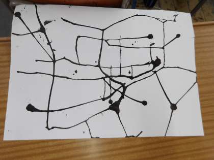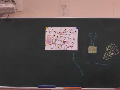 墨と絵の具を使った図工の作品で、カラフルないろと墨の黒とのコントラストがとてもきれいな作品です。それぞれがどんな色使いで仕上げるのか、楽しみな作品です。