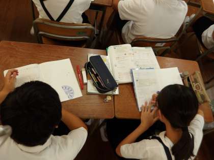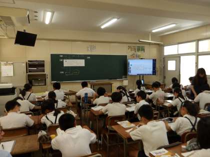 5年生の算数科の授業です。習熟度別に分かれての学習をしていました。今回はジュピターコースということで、教室いっぱいの児童が手を挙げて活発に意見交換する姿が見られました。