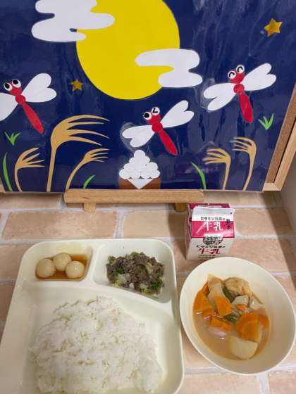 十五夜が「芋名月」と言われることや、十五夜にさといもを供える習慣があることから、さといもを使用したみそ煮をいただきました。「十五夜」は月が美しく見える時で、芋やだんごを供えたり、すすきを飾ったりしてお月見をします。今年の十五夜は10/6です。