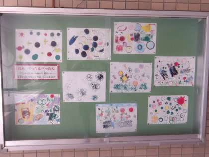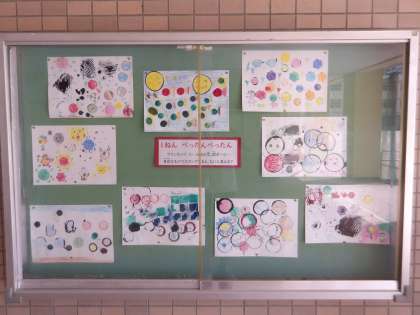 10月の玄関掲示が変わりました。今月は1年生です。様々なもので、スタンプをおした作品です。色あざやかで型にとらわれない自由な作品がとても1年生らしい作品です。