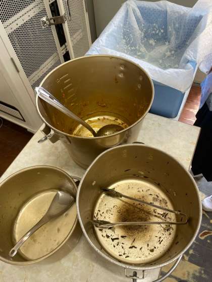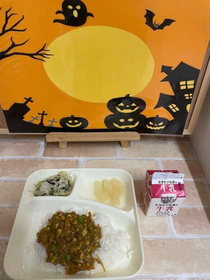 今日のカレーライスには鉄分が多く含まれている豚レバーチップ、大豆が入っています。カレーに入れることで食べやすくなるよう工夫されています。