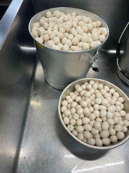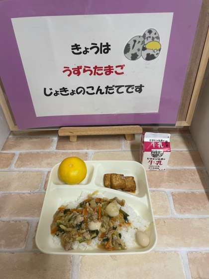 たくさんのうずら卵が入った中華丼は子どもたちに大人気でした。調理段階でうずら卵を入れる前に卵アレルギーのある子どもたちの分をとりわけるので、アレルギーのある子どもたちもみなと同じ給食が食べることができるよう工夫されています。