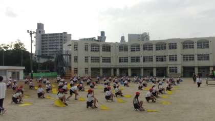フラッグを使った練習が進んでいます。そろえるところはそろえる、交互に振ったりタイミングをずらしたりとさまざまなパターンできれいな青と黄色の旗が揺れていました。