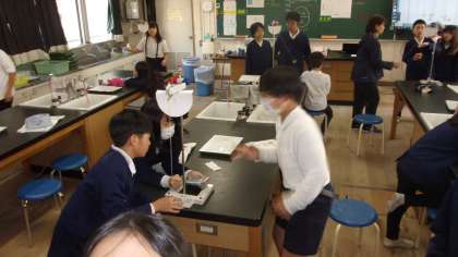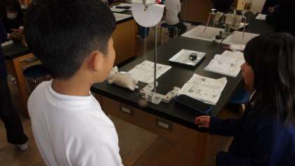 振り子の学習で楽しそうに実験を行っていました。結果を記録する人、振り子を持つ人など役割分担をしっかりと行い、楽しそうに実験を行っていました。