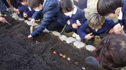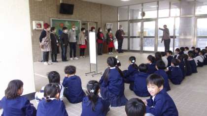 1年生の地域交流で、地域の方に来ていただき、1年生とともにチューリップ植えを手伝っていただきました。そのあとはお話をしたり、歌を歌ったりと楽しい交流ができました。