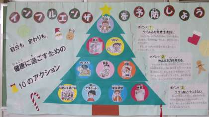 12月の掲示のテーマはインフルエンザについてです。インフルエンザの予防についてたくさんの情報が載っていますので、ぜひ見てみてください。漫画も下の方についています。