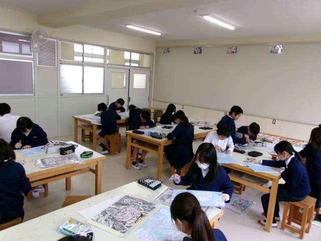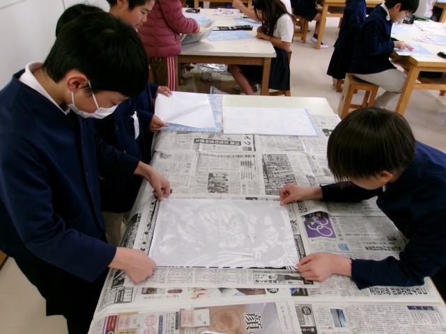 5年生の図工では版画をしています。版画のインクを塗り、写し取る作業をしました。二人一組で作業を行う場面も見られ、ゆっくり丁寧に作業していました。