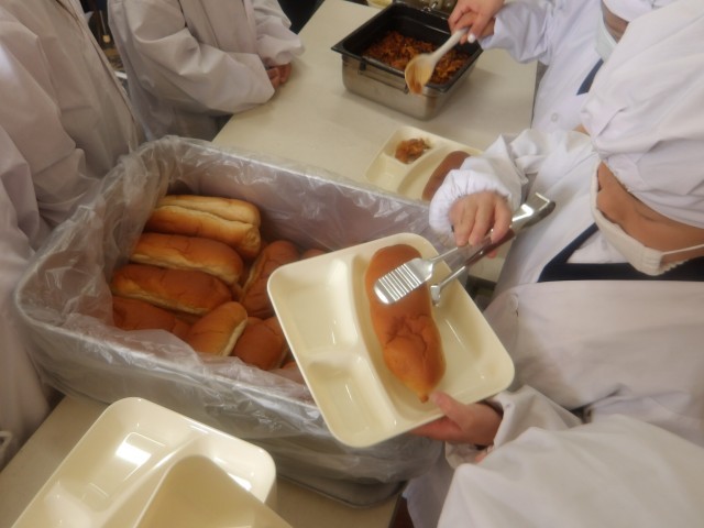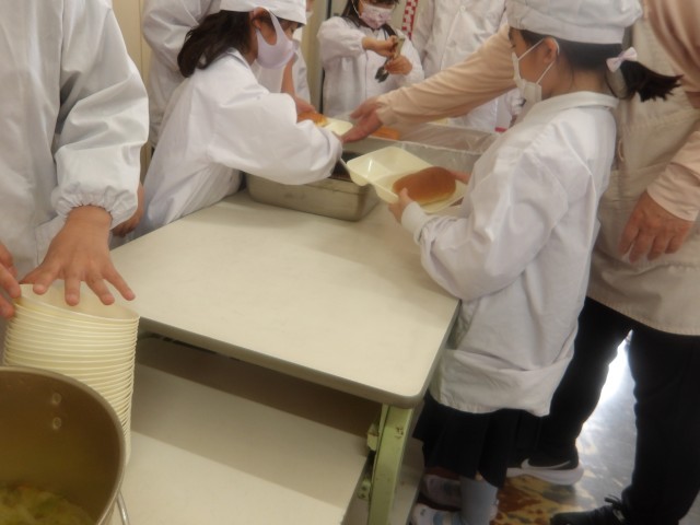 6年生に補助してもらいながら、1年生も自分たちで給食の準備をしています。