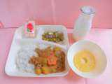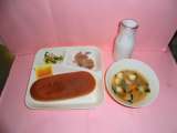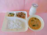 1/18(木)の献立は、豚肉のしょうゆマヨネーズ焼き、カレースープ、プチトマト、...