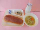 1/15(月)の献立は、あじのレモンマリネ、スープ煮、固形チーズ、黒糖パン、牛乳...