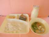 1/10(水)の献立は、ほたて貝のグラタン、スープ、和なし(缶づめ)、レーズンパ...