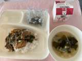 本日の給食献立は「マーボーあつあげ丼、中華スープ、ミニフィッシュ、ごはん、牛乳...