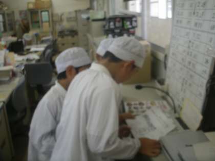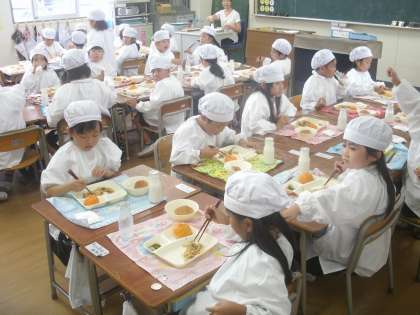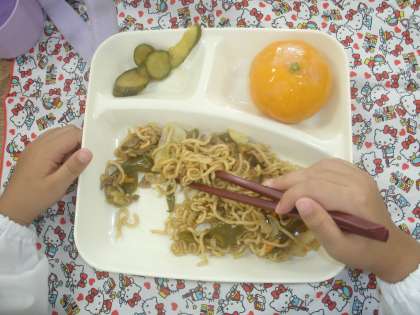 給食の今日の献立はやきそば。冷凍ミカンがデザートです。毎日、給食委員会の人が献立について、放送でお話ししています。(中の写真)
