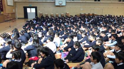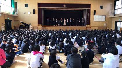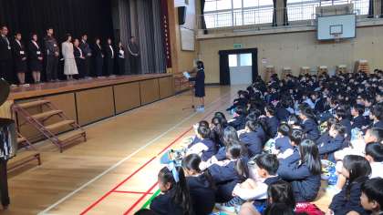 今年度、本校に着任された職員の紹介をしました。代表の児童から、歓迎の言葉をもらいました。