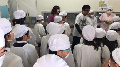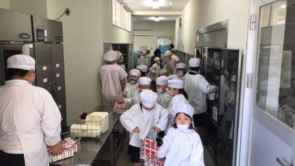 給食調理員さんが作ってくださったご給食を、クラスの当番が取りに行きます。