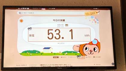 講堂入口の左手側に、講堂の屋根に設置された太陽光発電の状況を示すディスプレイです。今週、接続が完了しました。