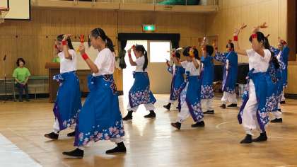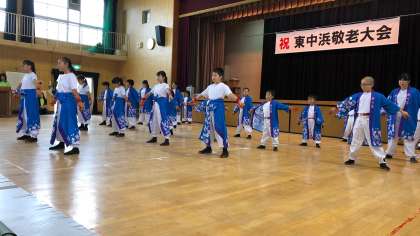 本日、本校講堂にて、地域の敬老大会が行われました。そこで、本校の子どもたちのチームさくらが、よさこいを披露しました。