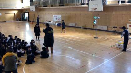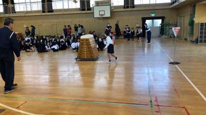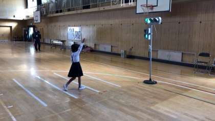 代表の子どもたちが、歩道の正しい歩き方を体験しました。