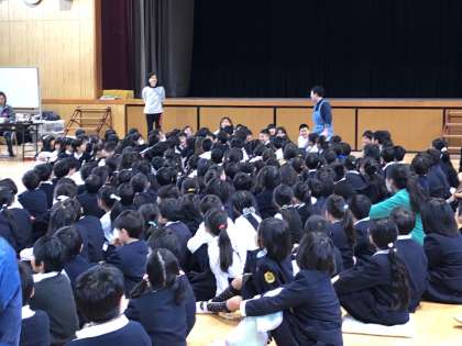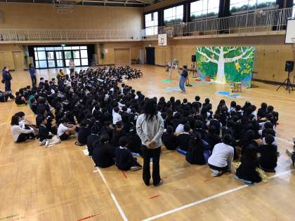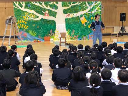 劇団の皆さんにお越しいただき、「カンアジトン」の一人芝居を鑑賞しました。子どもたちは、とっても楽しそうで、歓声が講堂に響きわたっていました。