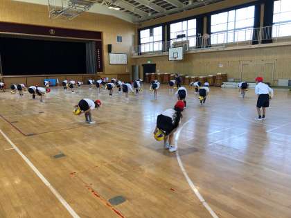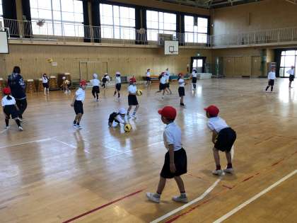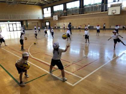 ボールを体の周りで回したり、2人でボールを投げたり受けたりしました。