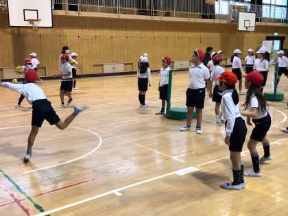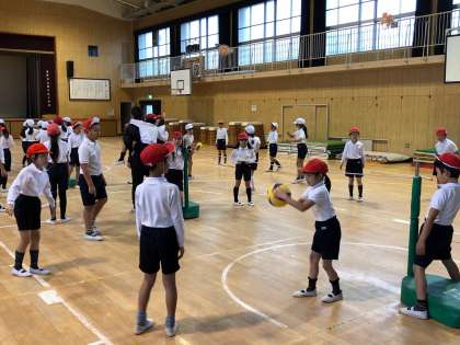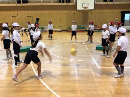 チーム内はワンバウンドさせて繋いで、相手チーム返すゲームをしました。