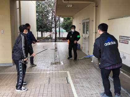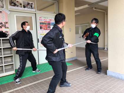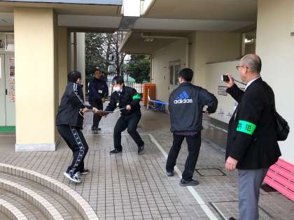 城東警察署の方のご指導のもと、防犯訓練を行いました。警察官の方が扮する不審者が、校内に侵入してきたという想定で行いました。不審者の発見、職員室から110番通報、そして、警察が来るまでの対応という流れです。