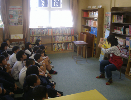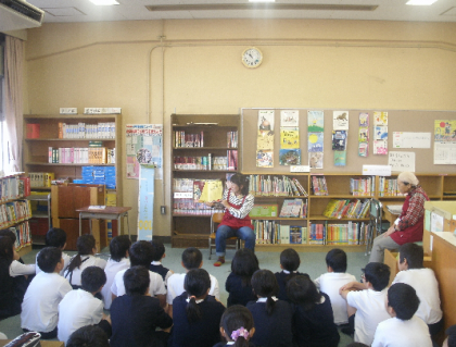 今週は読書週間。この時間には5年生が図書室で「おはなしポケット」のみなさんの読み聞かせを熱心に聞いています。