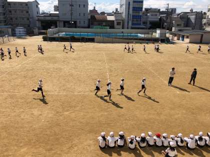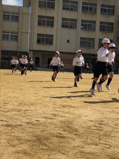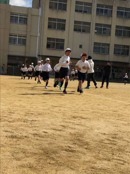 1・3組合同で、◯分間走を行ないました。外はとても寒かったですが、子どもたちは一生懸命走っていました。