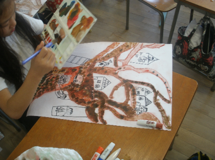 上:4年生「きになる木」コンテで描いた大きな木にサインペンで家やすべり台や人をかきこんでいます。気になります。