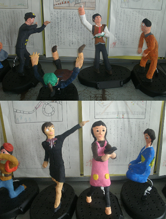下:6年生「未来に生きる私」自分の夢と希望の姿をねんどで表現します。動きの瞬間をとらえています。副題は「時間よとまれ」。