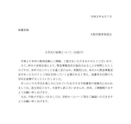 大阪市教育委員会からのお詫び 公開日 2020/04/07 更新日 2020/04/07 ひがなか日記 大阪市教育委員会から本日の入学式延期についてお詫びの文章がまいりましたので掲載いたします。 いいね(0)