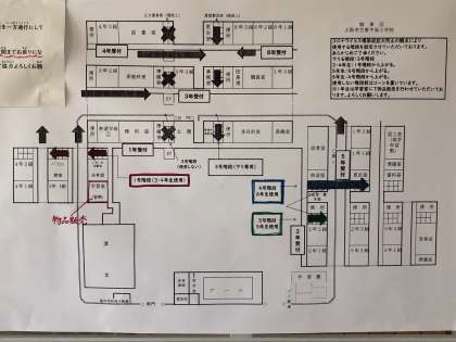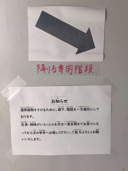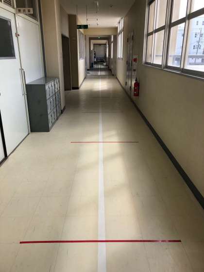 お越しになられた保護者同士の濃厚接触をさけるため、廊下に2メートル間隔でテープをお付けしています。お待ちの際は、そのテープごとにお並びください。